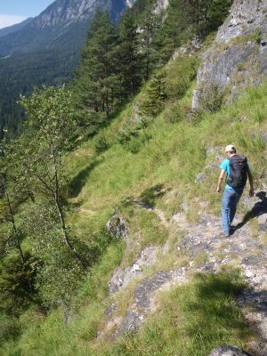 Von der Rofanspitze wandern wir zunächst nach Nordosten und folgend dabei dem Weg Richutng Zireiner See. Wir gehen jedoch nicht zu diesem, sondern nehmen noch davor rechts den Weg Richtung Zireiner Alm. Über Almwiesen wandern wir an dieser vorbei und gehen anschließend kurz auf einem Forstweg bergab, ehe ein Weg rechts zur Bayreuther Hütte führt. Auf diesem steigen wir weiter bergab, und erreichen die Hütte nach kurzem, batzigen Bergauf wieder. Von dort erfolgt der Abstieg über den bereits bekannten Steinapfelsteig.