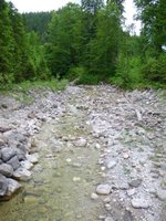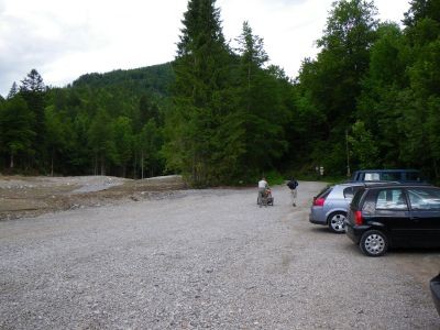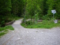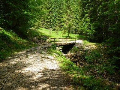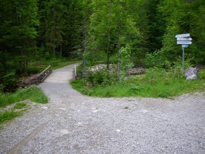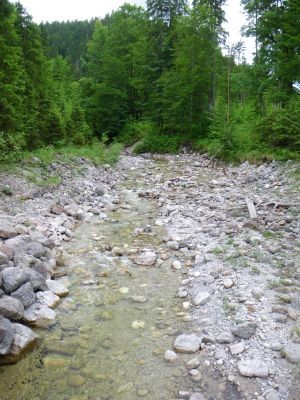 Von hier geht es auf einem breiteren Pfad Richtung Röhrlmoos-Alm. Bald geht der Weg in einen Fahrweg über, den wir in einer Kurve kurz vor der Amperthal-Alm rechts Richtung Röhrlmoos-Kapelle verlassen. Nun geht es an einem Bach über einen markierten Matschweg bis zur Kapelle hinab. Nach Regen (bei uns der Fall) war der Abstieg teilweise eher eine Rutschpartie als ein Abstieg. Am Gatter nahe der Kapelle gehen wir Richtung Osten (links) bis zur Alm. Hier verlassen wir den Fahrweg, gehen zwischen den Hütten hindurch und folgend den Wegweisern Richtung Glashütte. An einem Bach geht es nun zuerst über einen sehr steinigen, später über einen schönen Wanderweg hinab bis zur Bundesstraße. Hier wandern wir zuerst ein paar Meter an der Straße, ehe wir die Straße kreuzen und am Fluss bis zum Parkplatz zurückwandern.