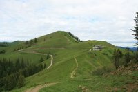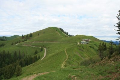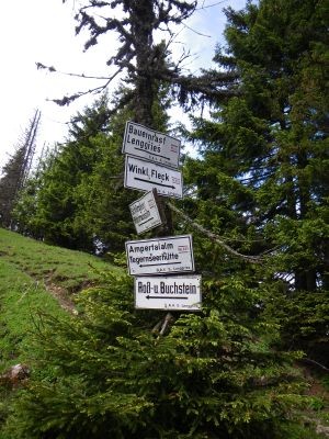 Auf dem Aufstiegsweg wandern wir wieder über den Weg nach Norden hinab bis zur Weggabelung im Hang zwischen der Alpenvereinshütte und dem Buchsteinhaus. Hier gehen wir noch einmal ein paar Meter ansteigend auf den Sattel südlich der Roßsteinalmen. An dem Almen halten wir Ausschau nach einem Pfad, der zum höchsten Punkt der Hochplatte führt. Von dort aus erkennt man den Weg Richtung Nordwesten wieder hinab zum Fahrweg. Auf diesem bleiben wir nicht lange. Vor den Amperthal-Almen biegen wir rechts auf einen Bergpfad ab, der Richtung Maria Eck führt. Wegweiser zum Schönberg ignorieren wir erst einmal. Ohne viele Höhenmeter auf und ab zu gehen erreichen wir bald die Weggabelung Maria Eck. Von hier steigen wir nach Süden auf einem matschigen Pfad hinauf zum höchsten Punkt des Schönbergs auf. Das Gipfelkreuz, das etwas unterhalb des höchsten Punktes im Westen steht, erreichen wir über den Wiesenpfad bergab.