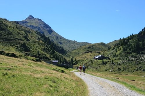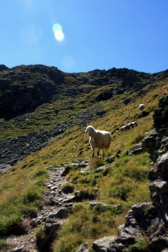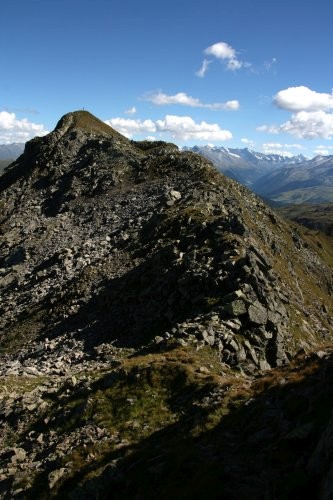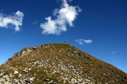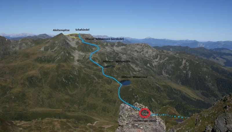 Der Weiterweg zum Aleitenkopf erfolgt in freiem unmarkierten Gelände. Hierzu folgt man meist dem Gratverlauf, wobei man einige Blöcke oft links herum leicht umgehen kann. Spätestens in der Scharte zwischen den zwei Gipfel wird es wieder deutlich leichter. Über Steinblöcke geht es an den Gipfel heran, der zuletzt über eine steile Wiese erreicht wird. Wer nicht wieder auf den Schafsiedel möchte kann nur bis zur Scharte zurück absteigen und von dort über dein großes Schotterfeld direkt zum Oberen Wildalmsee absteigen. Von dort geht es auf bekanntem Weg wieder bergab.