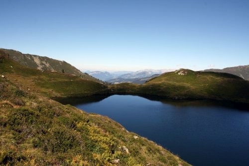 Dennoch haben wir immer noch fast 300 Höhenmeter vor uns. Ganz spät erst sieht man den verstecktestens der drei Wildalmseen. Hier am Oberen Wildalmsee geht man ebenfalls links vorbei und sieht schon den Gipfel des Schafsiedels und des Aleitenkopfs. Zu ersterem geht es nun in circa 15 Minuten über einen steilen Bergpfad hinauf.