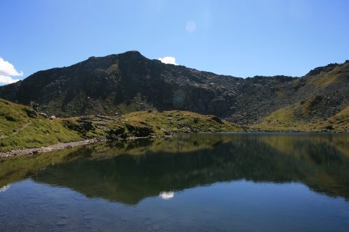 Der Weiterweg vom Schafsiedel führt um die Hütte herum und kurz darauf rechts den Hang hinauf. Auf einem Pfad gewinnt man nach dem flachen Stück zuvor wieder deutlich schneller an Höhe. Nach etwas mehr als zwei Stunden ist dann der Untere Wildalmsee erreicht. Da dieser meiner Meinung nach der schönste der drei Seen ist sollte man hier doch ein paar Minuten Pause machen oder einfach nur die Blicke genießen. Der Weiterweg führt in gut zehn Minuten zum Mittleren Wildalmsee. An diesem geht es links herum vorbei.