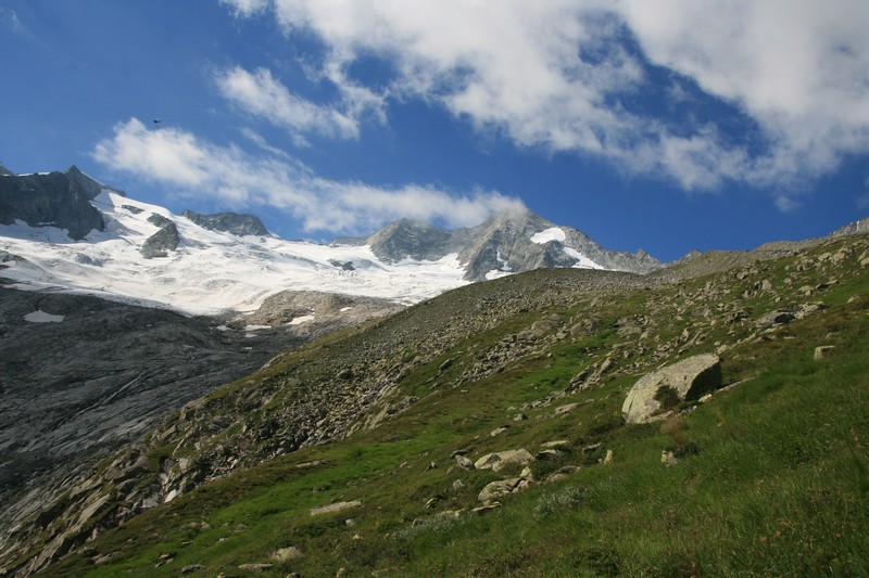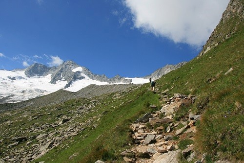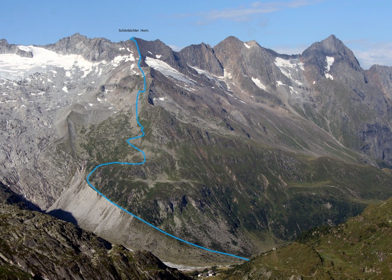 Kurz hinter dem Gasthaus wechselt man die Bachseite und lässt die Jausenstation Waxeggalm rechts liegen. Zwischen Sträuchern geht es nun bergauf. Auf gut 2000 Höhenmetern trifft man auf den Berliner Höhenweg, der nun nahe einer Abbruchkante hinauf führt. Die frühere Ausdehnung des Gletschers bis hier herab ist an den Felsen gut zu erkennen. Über Platten geht es weiter hinauf. Ab 2300 Höhenmetern orientiert sich der Weg immer mehr Richtung Schönbichler Grat, der in einigen Kehren erreicht wird. Diesem folgend nähert sich der Aufstieg nun deutlich ausgesetzter dem schon sichtbaren Gipfelkreuz. Mit zunehmender Höhe wird der Weg ausgesetzter. Zuletzt helfen Drahtseile beim Aufstieg, die fast an das Gipfelkreuz heran verbaut wurden.