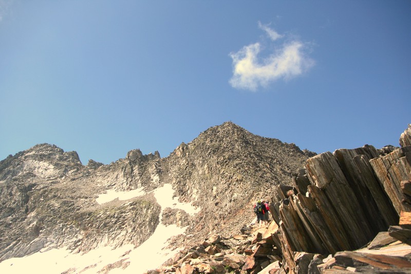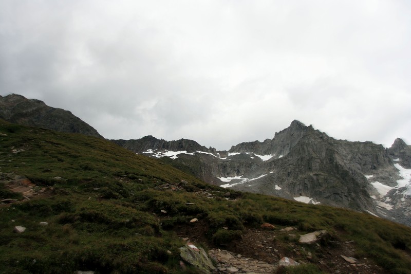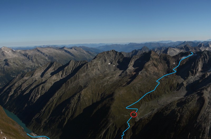 Vom Gipfel geht es kurz zurück zum Aufstiegsweg, ehe der Abstieg zum Furtschaglhaus nach Süden leitet. Wegtechnisch leichter als der Aufstieg, aber ähnlich gut versichert verliert man rasch an Höhe und steigt bis zu einer Kante ab, von der das Alpenvereinshaus schon sichtbar ist. Dorthin werden über Serpentinen zunächst rasch Höhenmeter abgestiegen, ehe ein Höhenweg nun mäßig fallend durch das Furtschaglkar zum Furtschaglhaus leitet.