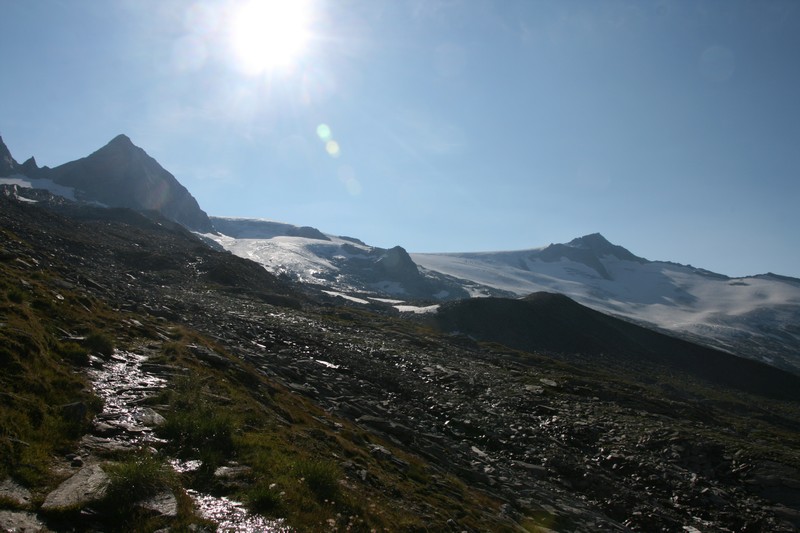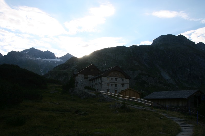 Direkt am Parkplatz in Breitlahner beginnt der breite Fahrweg Richtung Berliner Hütte. Nach Überquerung des Baches geht es kurz steigend durch den Wald bis bald die Klausenhütte erreicht wird. Die nächsten 1,5 Kilometer geht es nun fast eben taleinwärts, ehe der Anstieg zur Grawahütte beginnt. Hinter dieser sind es noch einige Kehren bergauf, die Straße sich deutlich über den Bach erhöht. Auf betonierten Elementen geht es nun nur noch mäßig zur Alpenrosenhütte. An der Alpenrosenhütte geht es rechts vorbei und kurz darauf links über einen Bergwanderweg zur Berliner Hütte hinauf.