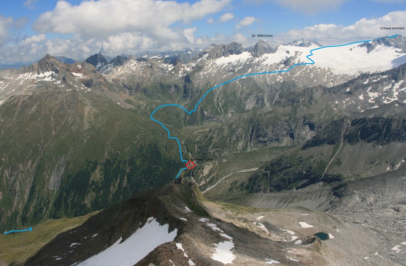 An der Berliner Hütte geht es der Beschilderung zur Schwarzensteinhütte folgend links vorbei. Man bleibt dabei gut 200 Höhenmeter auf dem Berliner Höhenweg, ehe es auf einer Verzweigung auf 2.256 Metern rechts zunächst eben weiter geht. Relativ flach wechselt man nun auf die Südseite des Zemmbaches. Der Bergpfad führt bald in einigen Kehren auf einen Hang auf gut 2.400 Höhenmetern hinauf. Nun wieder deutlich flacher, aber auch schon deutlich hochalpiner folgt man den roten Markierungen Richtung Gletscher. Der erste nördliche Gletscher ist jedoch spaltig, sodass man unter einem Felssporn unten herum geht. Über ein längeres Schneefeld ist der Gletscher auf schätzungswiese 2950 Metern (Stand 2013) erreicht. Dort geht es in Kehren Richtung Schwarzensteinsattel hinauf, wobei man sich kurz davor bereits nach Süden hin orientieren kann. Nun deutlich leichter führt der Weg auf den Gipfel zu. Zuletzt leitet ein kleiner Grat nahe des Gletscherabbruchs an den Fels heran, auf dem es die letzten 3 Minuten mit leichter Blockgratkletterei zum Gipfelkreuz geht.