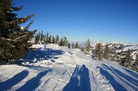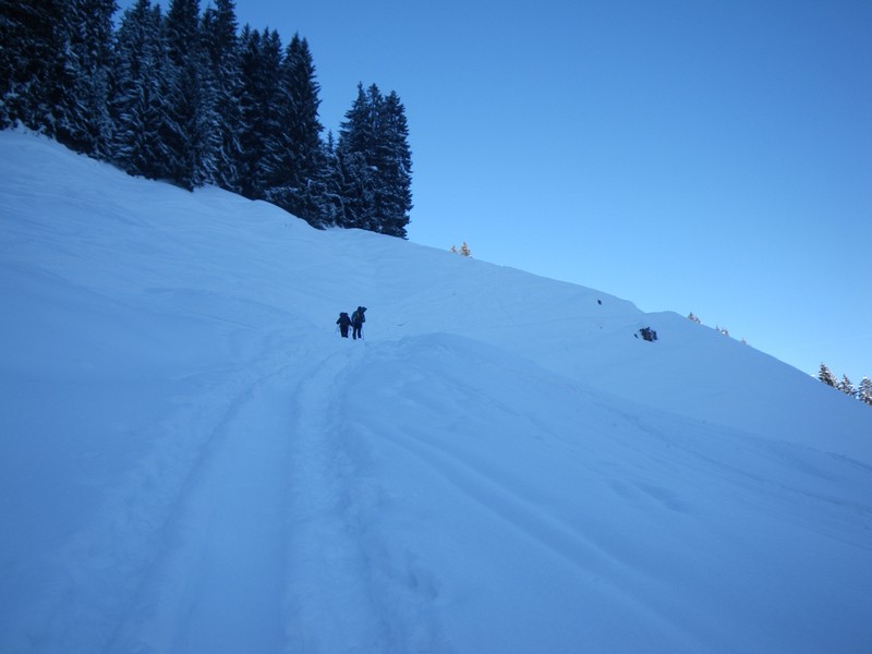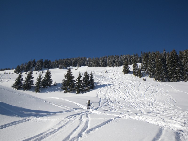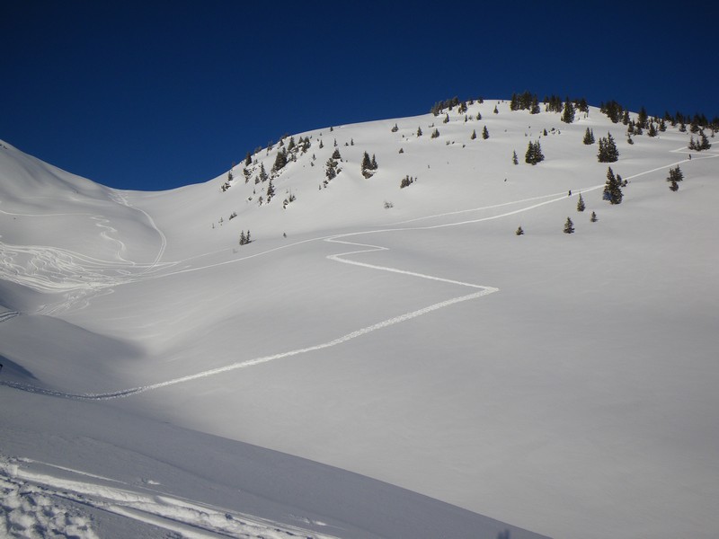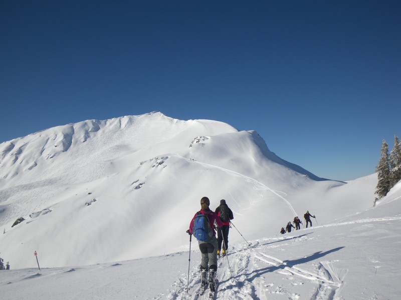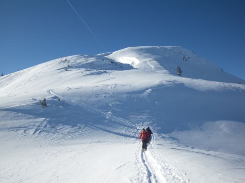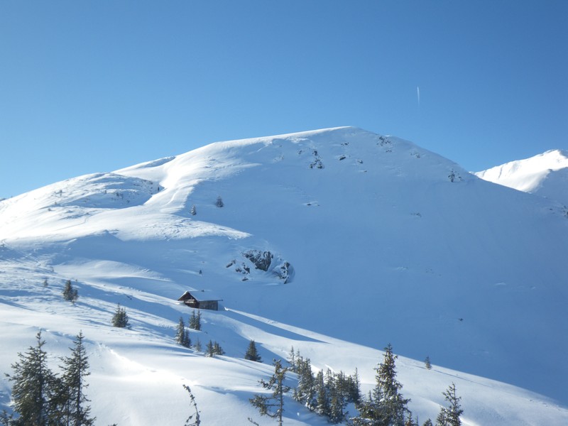 Wir parken etwas oberhalb der Oberlandhütte und gehen zunächst noch wenige Meter taleinwärts, ehe es rechts über eine Brücke geht. Hinter einigen Häusern ist bereits die Schneise zu erkennen, an deren linken Rand wir nun aufsteigen. Der Aufstieg zieht sich bald in einem weiten Bogen nach Norden, ehe es nach einem Knick nach Süden direkt zur Durchalm (circa 1.400 Hm) geht. Mit ähnlich mäßiger Schwierigkeit führt der Aufstieg nun deutlich nach Norden, bis sich links eine breite Schneise den Hang hinauf schlängelt. Wir folgen dieser bergauf, bis der Durchacher Kogel erreicht ist. Hinter diesem gehen wir nun flach und teilweise auch etwas bergab nach Süden in die Senke nahe der Breitlabalm. Hier geht es links um einen schwach ausgeprägten Gipfel, hinter welchem ein letztes Mal bergab gefahren werden muss (circa 30 Höhenmeter).