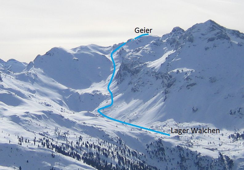Von der Alpenvereinshütte folgt man zunächst taleinwärts dem Lizumer Boden. Das erste Stück ist dabei sehr flach, was sich bald ändert. Man steigt dabei rechts an den Hängen der Lizumer Sonnenspitze auf und folgt dem Geierkar bergauf. Unterhalb des Gipfelanstieges wird es bei der Wegverzweigung am Übergang zum Jungsee noch einmal kurz flach, ehe es auf der rechten Seite des Hangs zum Gipfel hinauf geht. Die letzten Meter werden wieder flacher. Oben angekommen wartet eine herrliche Aussicht in alle Richtungen mit Fernblicken auf die Stubaier Alpen, aber auch Nahblicke auf den Tuxer Kamm der Zillertaler Alpen mit dem dominierenden Olperer.