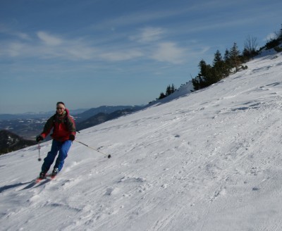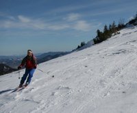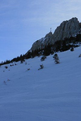 Wir starten am großen Parkplatz in Hintergschwendt und steigen auf dem Forstweg Richtung Maisalm auf. An den Wegweisern folgen wir stehts den Wegen zur Gorialm (nicht zur Steinlingalm!) bis wir im Pistengelände oberhalb des Liftstüberls landen. Über das Goriloch steigen wir am Pistenrand bis kurz vor die Steinlingalm auf. Wir verlassen die Piste nach rechts und steigen zwischen den Latschen bis kurz unterhalb der Schlechinger Scharte auf. Dort lasen wir die Skier zurück und steigen durch die so genannten Kaisersäle nach Osten bis sich das Kreuz vor einem erhebt. Zuletzt geht es über einen Kettenversichteren Steig und eine Brücke zum riesigen Chiemgaukreuz am Kampenwand-Ostgipfel Abstieg und Abfahrt entlang der Aufstiegsroute.