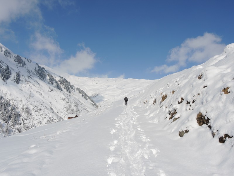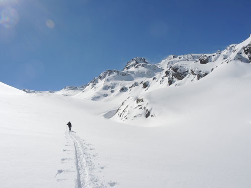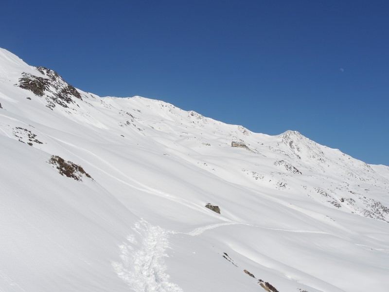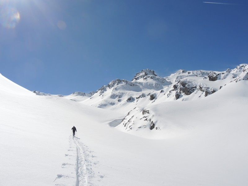 Der Weiterweg erfolgt nun zur Seeegrube und von dort zum Gipfel. Erscheint das Gelände hier noch sehr unwegsam ergibt sich die Route mit der Zeit relativ logisch. Zunächst orientiert man sich entlang des sommerlichen Fahrwegs, der einen Knick nach Süden macht (etwa auf 2000 Höhenmeter). Unter den Hängen des Roßkogels bleibt es weiter flach, ehe man vom rechten Hang auf die mittlere Schulter wechselt. Auf diesem geht es noch kurz bergauf, bevor gut 40 Höhenmeter in die Seegrube abgefahren werden.