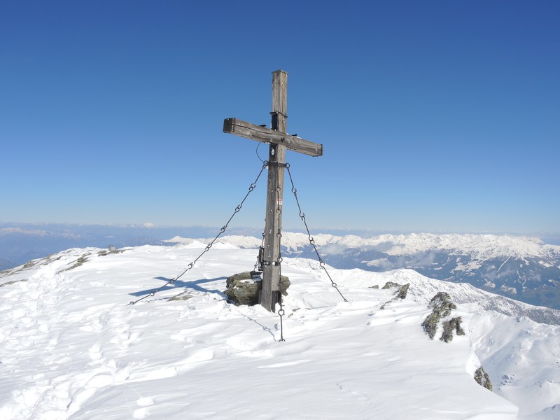 Unten in der Seegrube angekommen teilt sich das Kar. Rechts erkennt man schon den Gipfel. Wir gehen jedoch links und folgen dem flacheren Kar. Mit zunehmender Höhe wird es wieder steiler. Nach einem leichten Knick nach rechts ist bald die Ostflanke des Gipfelaufbaus zu erkennen. Auf den Sattel zwischen Hoarberhjoch und Rastkogel wird es zuletzt noch einmal steiler. Kurz darauf wird das Skidepot eingerichtet und die letzten 50 Höhenmeter werden zu Fuß absolviert. Nach einem kurzen steilen Aufschwung mit Stufen schlagen geht es dabei zum Gipfelkreuz entlang des Grates.