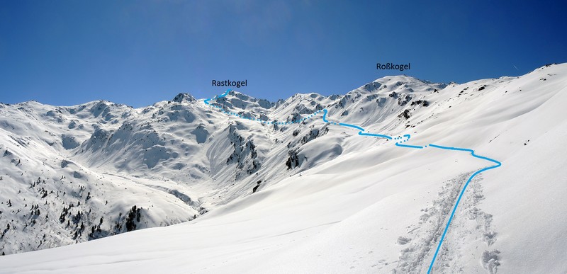 Abfahrt entlang der Aufstiegsroute. Wem dies nicht reicht kann zusätzlich den Roßkogel mitnehmen oder für eine Einkehr die paar Höhenmeter zur Rastkogelhütte aufsteigen.