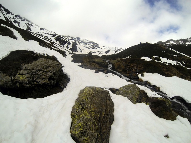 Ab der Oberkaralm folgt man dem Sommerweg etwas oberhalb des Baches immer weiter taleinwärts. Dort, wo sich das Tal deutlich nach rechts führt nimmt man nicht rechts den Sommerweg direkt zur Öfeleralm sondern bleibt etwas mehr im Talkessel. Nach Überquerung der Bäche führt die weitere Tour zwischen Latschen mit immer mehr Schnee nach Westen. Orientierung bietet hier nur die Öfeleralm (1.988 Meter), die etwa 250 Meter nördlich der Aufstiegsroute liegt. Nach kurzem flacheren Stück erfolgt nun der Aufstieg zur Öfelerscharte zwischen Grubachkopf und Torhelm. Auf dem Gipfelgrat geht es von hier aus noch die letzten 200 Höhenmeter zum Kreuz hinauf.