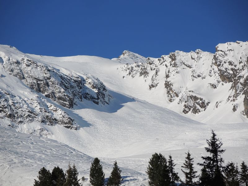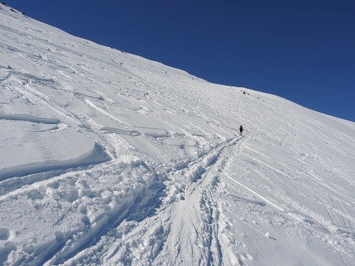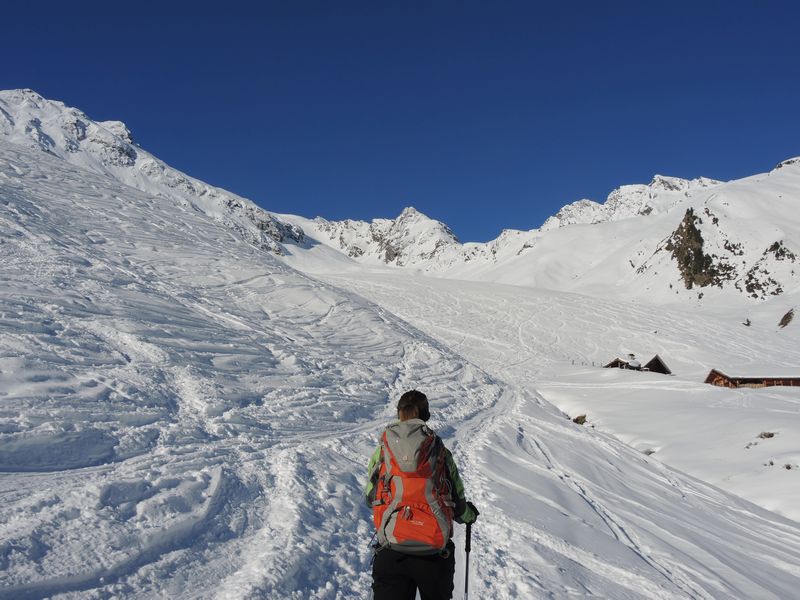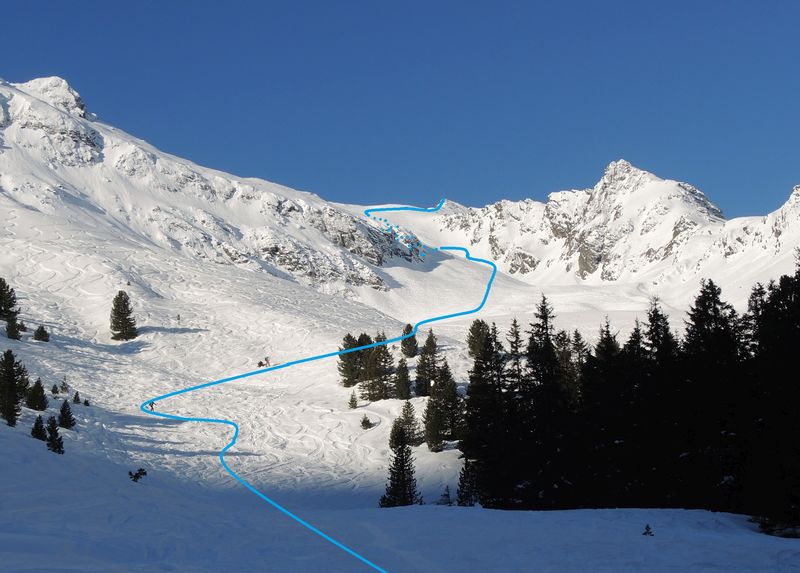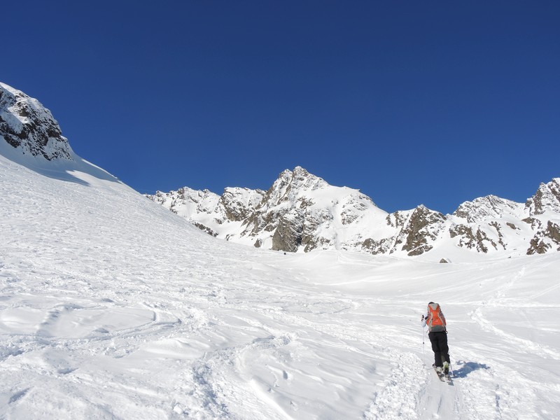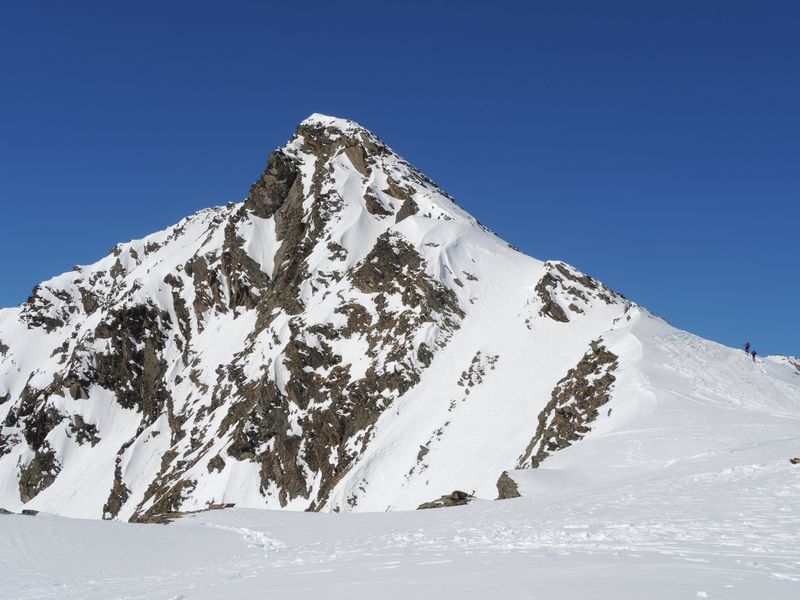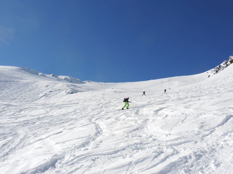 Abfahrt mehr oder weniger entlang der Aufstiegsroute. Alternativ kann über das westlichere Sattelloch bei sicheren Verhältnissen abgefahren werden.