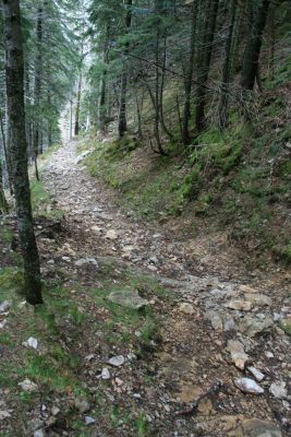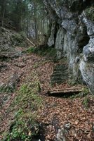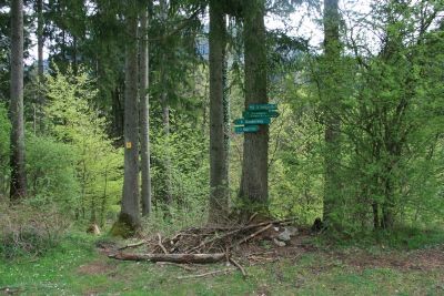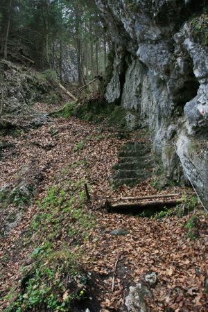 Wir starten unterhalb der Kirchen und gehen zunächst Richtung Ponyhof. Diesen lassen wir jedoch links liegen, und wandern weiter über die Felder Richtung Maiermühle. An dieser gehen wir vorbei und steigen zum Stausee auf, an dem wir rechts vorbei wandern. Kurz darauf verlassen wir den Forstweg und folgen dem schwach markierten Weg den Hang hinauf. Nach wenigen Metern im Wald wählen wir den rechten Wanderweg und steigen nun in Serpentinen über umgefallene Bäume bis zu einem Fahrweg auf, dem wir ein paar Minuten bergauf folgen bis ein weißes Schild uns nach Arzmoos leitet. Über den steiler werdenden Pfad erreichen wir das eigentliche Ziel der Tour: Die Steinerne Stiege. Dies hört sich besonders an, ist aber im Grunde nur eine Treppe, die in den Felsen gehauen wurde.