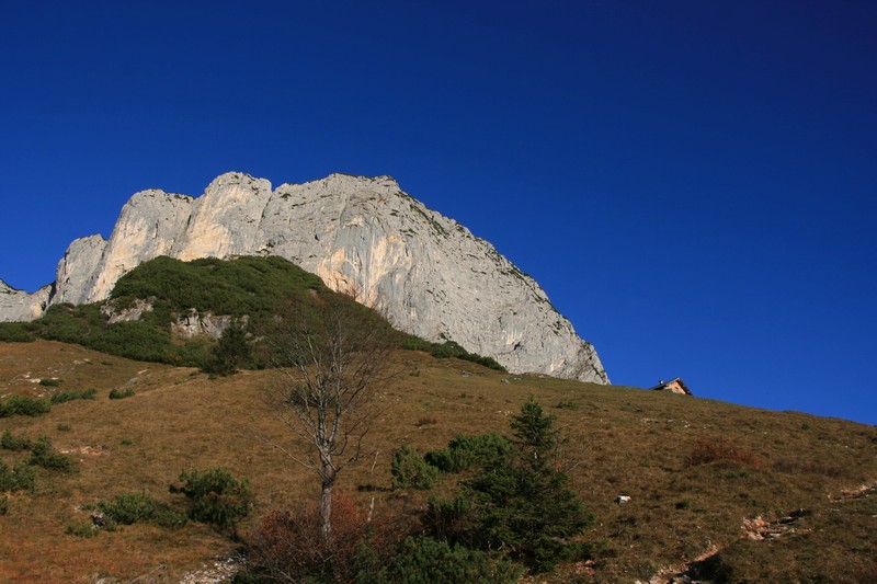 Der Abstieg erfolgt über die Toni-Lenz-Hütte. Dazu geht es zuerst zur Mittagsscharte zurück. Hier folgen wir der Beschilderung zur Schutzhütte. Über den teils spektakulär in den Fels geschlagenen Thomas-Eder-Steig verlieren wir rasch an Höhe. An der Hütte geht es direkt vorbei und weiter steil bergab, Mit der Zeit wird der Weg immer breiter, bis man auf einem Fahrweg hinab wandert. Auf ungefähr 700 Höhenmetern verlassen wir den Wanderweg um mit möglichst wenig Umweg zurück zum Ausgangspunkt zu gelangen. Mit etwas Sucherei quert man den Bachgraben und entdeckt den verfallenen Weg auf der anderen Seite. Diesem folgt man nun hinab zur Kohlstatt-Diensthütte. Nur einmal verzweigt sich der Weg, wobei man sich hier links hält. An der kleinen Hütte geht man kurz links die Straße hinauf und erreicht gleich einen Fahrweg nach Südosten. Der Weg wird immer steiler bis die Fahrstraße erreicht wird. Auf dieser geht es die letzten 10 Minuten zum Parkplatz zurück.