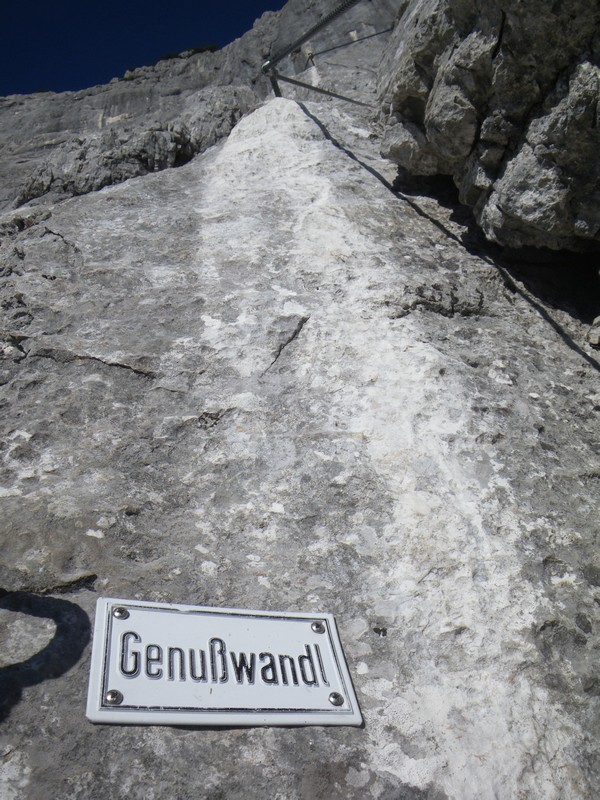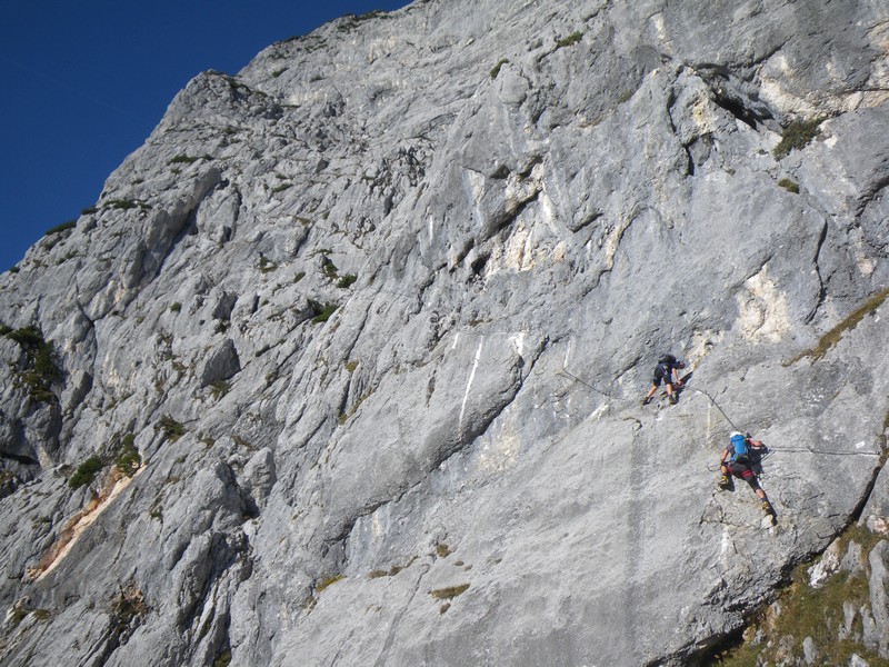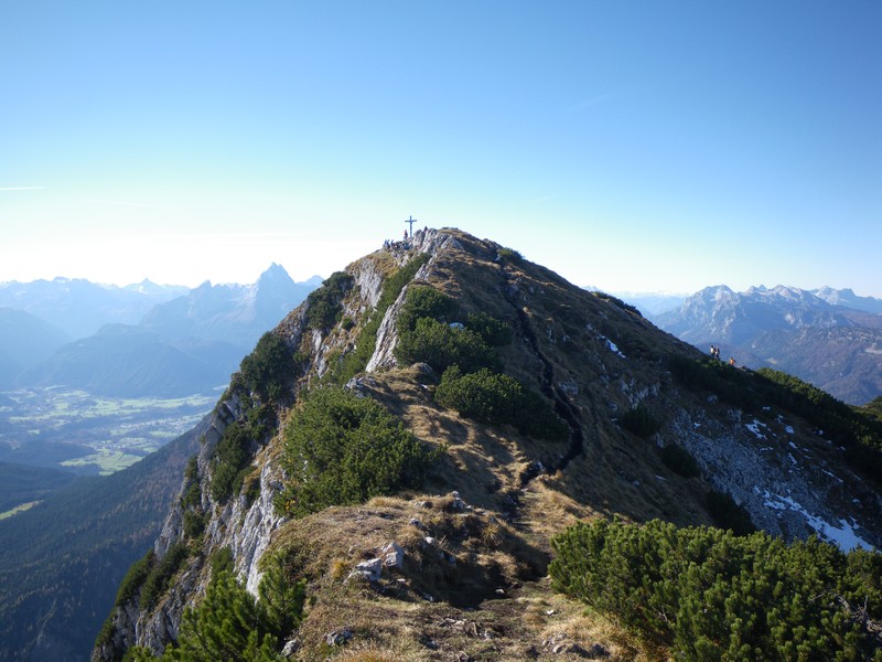 Der Hochthronklettersteig führt nun auf dem direkten Weg durch die Südostwand zum Gipfel hinauf, wobei die Kulisse mit Göll, steinernem Meer und vor allem Watzmann mehr als spektakulär ist. Mehr zu diesem Tourabschnitt unter Hochthron Klettersteig. Vom Austieg sind es dann nur noch wenige Meter zum Gipfelkreuz des 1.873 Meter hohen Berchtesgadener Hochthrons.