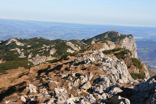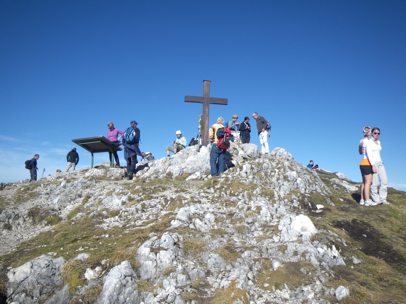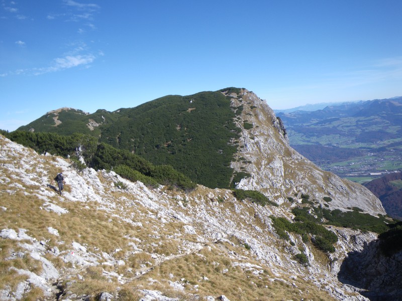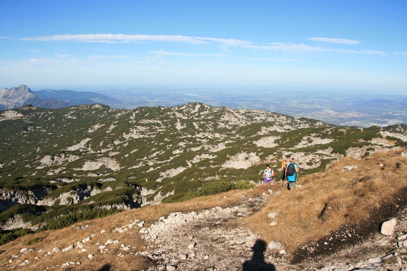 Hier beginnt nun die eigentliche Überschreitung. Zunächst steigt man zu einem Taferlbaum ab und nimmt hier den Weg zum Salzburger Hochthron. War die Zeit zum ersten Gipfel auf den Schildern reichlich bemessen ist die Angabe 1:45 recht sportlich, aber machbar. Der Weg schlängelt sich nun mir einigen Gegenanstiegen leicht fallend nach Norden. Die vielen Kurven machen den Weg zwischen den.Latschen landschaftlich sehr reizvoll, doch so recht vom Fleck kommt man nicht. Nach einer guten dreiviertel Stunde steigt man in die Mittagsscharte ab, von welcher es noch einmal 200 Höhenmeter plus die gewohnten Gegenanstiege zum Salzburger Hochthron hinauf geht.