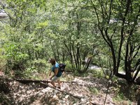 Der Abstieg erfolgt in einem weiten Bogen nach Osten über einige Höfe. Zunächst muss über einen bis jetzt noch wenig ausgetreten Pfad abgestiegen werden. Nach gut 10 Minuten wird ein Fahrweg erreicht. Auf diesem bleibend geht es flach zu den Höfen, ehe der Abstieg zur Hauptstraße erfolgt. Auf dieser sind es dann noch einmal 15 Minuten zurück zum Ausgangspunkt. Alles in allem sollten für die Gesamtour 2-2,5 Stunden eingeplant werden.