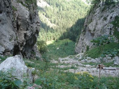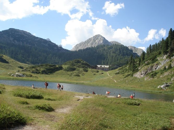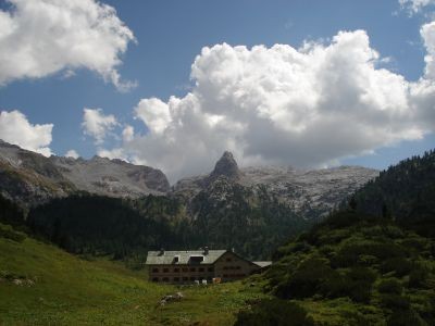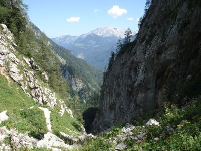 Wir starten am Großraumparkplatz in Schönau am Königsee und wandern zuerst mit den Touristen zum Schiff, welches uns nach St. Bartholomä bringt. In St. Bartholomä gehen wir Richtung Süden und folgen den Wegweisern zum Kärlingerhaus (manchmal auch Funtenseehaus). Zuerst geht es eben am See entlang, wo auch noch einige Touristen entlang laufen. Sobald es aber durch das Flussdelta des Eisgrabens geht ist man unter Gleichgesinnten. Nach wenigen Metern geht es nun aufwärts und der See rückt immer weiter in die Ferne. Wir überqueren den Schrainbach , und schon bald legen wir die ersten 250 Höhenmeter in Serpentinen zurück bis wir eine Holzhütte erreichen, bei der wir den Schrainbach wieder überschreiten. Nun geht es wieder mäßig steil nach Südwesten bis wir die Saugasse erreichen. In kürzester Zeit legen wir in circa 20 Kehren über 350 Höhemeter zurück. Oben angekommen kommt die Sonne wieder ein wenig hinter den riesigen Felstürmen hervor. Wieder weniger steil geht es nun bis zum Funtenseesattel gemächlich bergauf. Von dort wandern wir mit Blick auf das Kärlingerhaus leicht bergab und können mit etwas Glück Murmeltiere sehen. Am Alpenvereinshaus, das leicht an einen Mix aus Kantine und Hotel anmutet gibt es nun erst einmal eine lange Pause. Die Tour ist auf Zwei Tage zu empfehlen, denn dann kann man sich einen schönen Nachmittag am See machen und den Sonnenuntergang am Schottmalhorn bewundern.