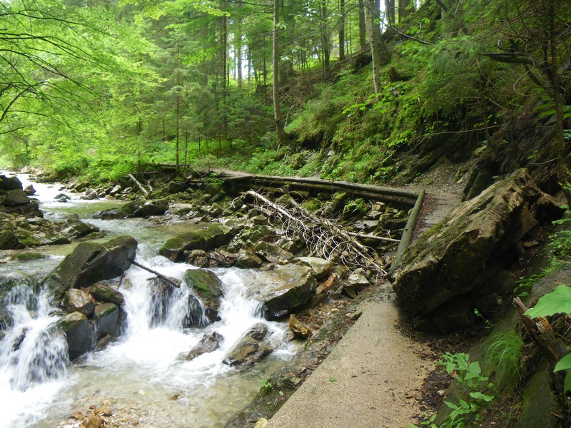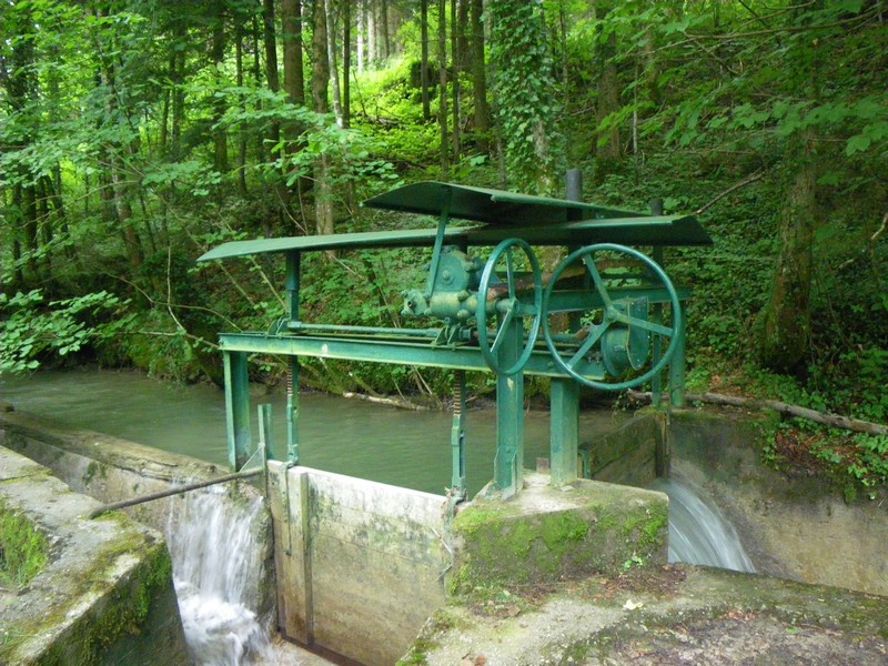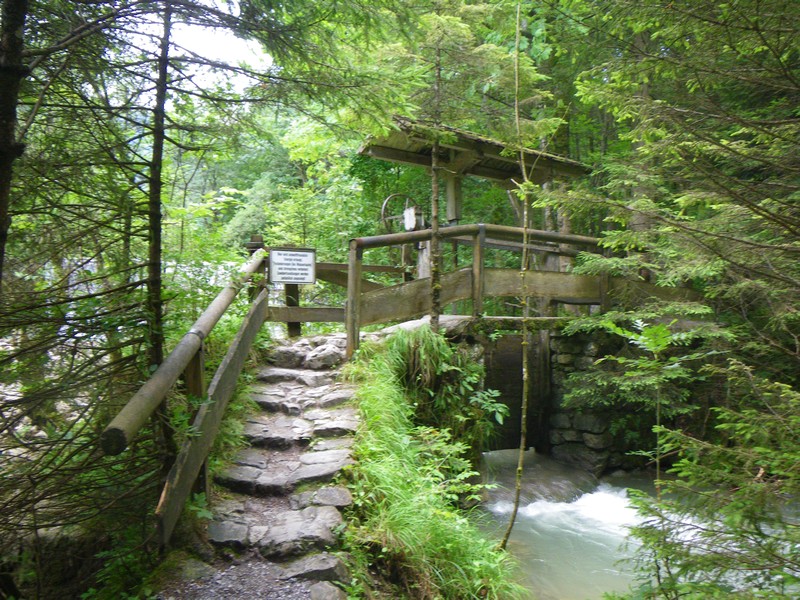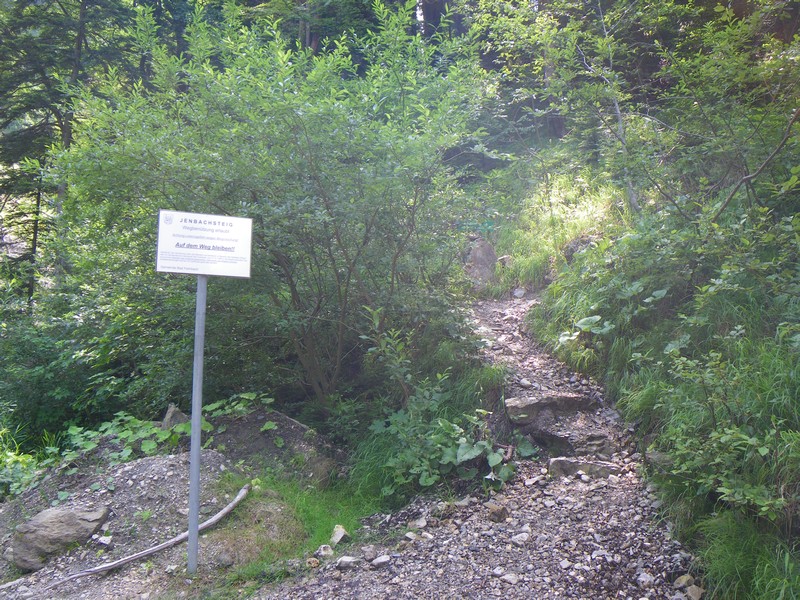 Am Parkplatz weisen die Schilder den Weg zum Jenbachtal. Noch vor der Brücke geht man rechts und folgt dem immer deutlichen Pfad stets taleinwärts. Mal näher mal ferner des Baches geht es hierbei immer leicht bergauf. Dabei sieht man immer wieder wie der Mensch den Bach verändert hat: einerseits als Energiequelle wie das kleine Wehr zur Ableitung des Baches (Galerie) oder zu seinem eigenen Schutz, was man an den großen Schutzwällen sieht.