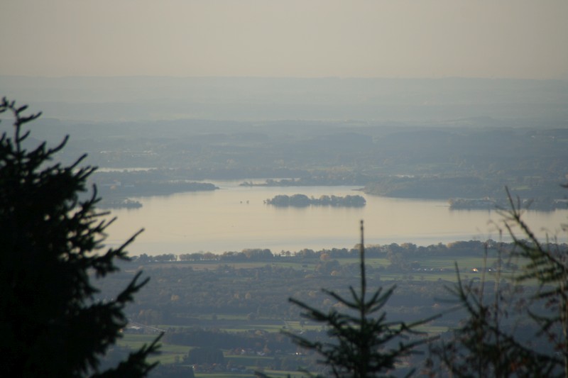 Am Ende der öffentlichen Straße folgt man dem Fahrweg leicht ansteigend bis zur ersten Kreuzung. Dort leiten die gelben Schilder geradeaus. Diese Tour wählt jedoch den direkteren Anstieg, sodass man hier rechts abbiegt. Der Straße folgt man nun eine Zeit lang, ehe sich diese nach links und rechts verzweigt. Gerade aus führt ein Weg direkt Richtung Zinnkopf. Auf einem breiten Wanderweg geht man weiter nach Südosten bis links ein alter Wegweiser nun deutlich steiler auf einem Pfad hinauf leitet. Nach einiger Zeit kreuzt man einen Forstweg. Auf der anderen Seite geht es ähnlich wie bisher weiter. Auf circa 1000 Höhenmeter kreuzt man zum letzten Mal einen Fahrweg und nun wird es auch etwas steiler. Kurz unterhalb des Gipfels trifft man auf den nordseitigeren Anstieg. Diese Stelle sollte man sich für den Abstieg merken, da unser Aufstieg hier nicht beschildert oder markiert ist. In einer letzten Kehre nähert man sich nun der Waldgrenze bis das Gipfelkreuz erreicht wird. Dort angekommen bietet sich je nach Standpunkt ein Blick auf den Chiemsee, Hochfelln oder Rauschberg.